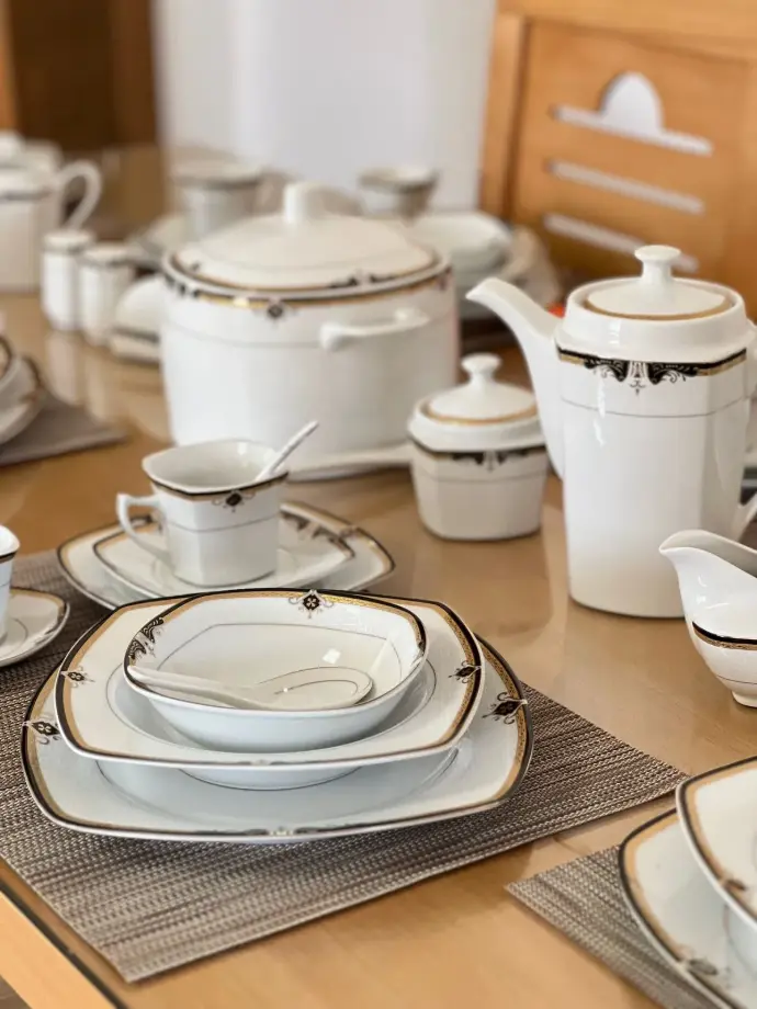 Ce service contient absolument tout ce dont vous avez besoin, que ce soit pour un dîner intime ou une grande réception. Assiettes plates, creuses, carrées, soupières, plats de service, tasses, théière, sucrier, cuillères de service, bols, accessoires pour épices…