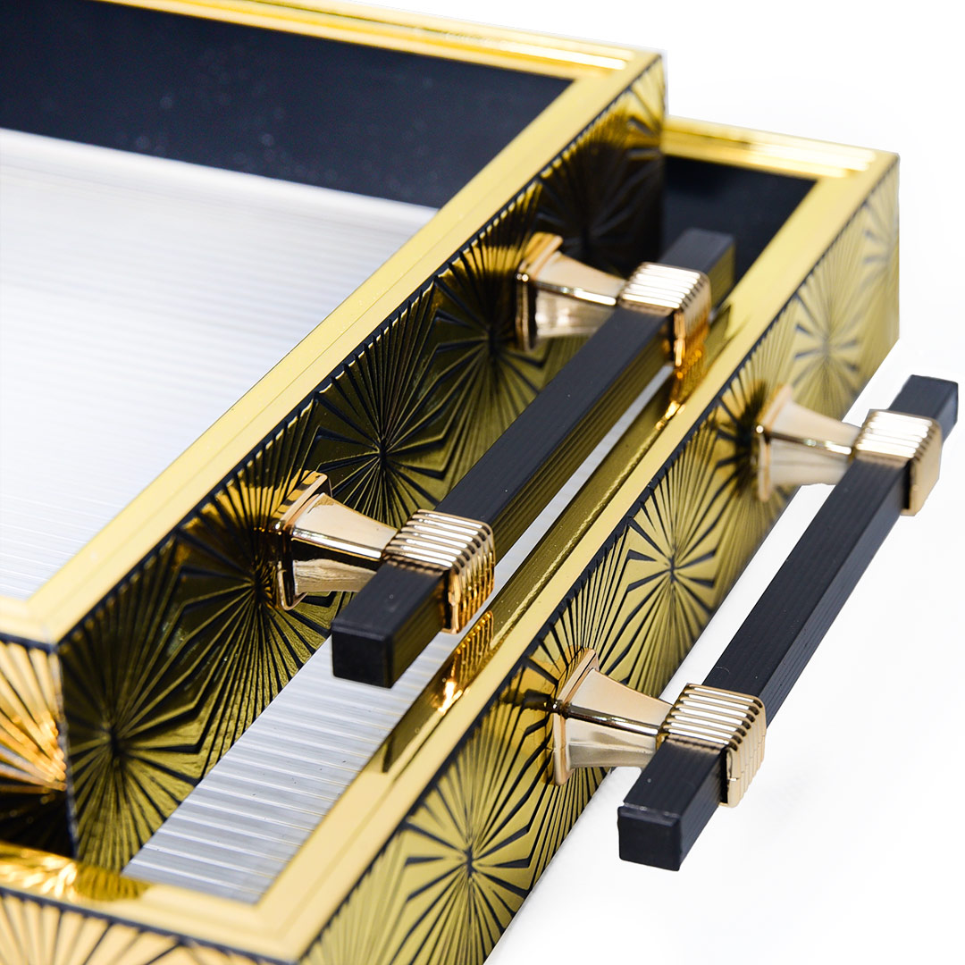 👑 UN DESIGN LUXUEUX ET ÉLÉGANT 🌟 Plongez dans l'élégance du style Art Déco avec le motif géométrique raffiné, alternant le noir et l'or. Les poignées dorées en métal ajoutent une touche de glamour, faisant de ces plateaux de véritables pièces maîtresses. C'est l'accessoire parfait pour sublimer votre table, votre bar ou votre buffet. 🥂