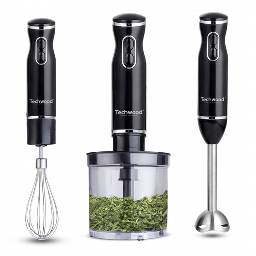 Mixeur Plongeant Techwood Inox Noir 3en1 Pieds Inox, Bol Hachoir 500ml & 2 Vitesses – TMS-9666