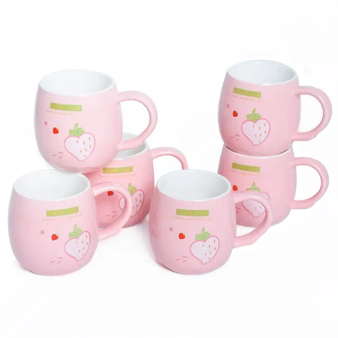 Six tasses assorties, chaque tasse invitant à savourer la douceur de la vie avec une illustration délicate de fraise.